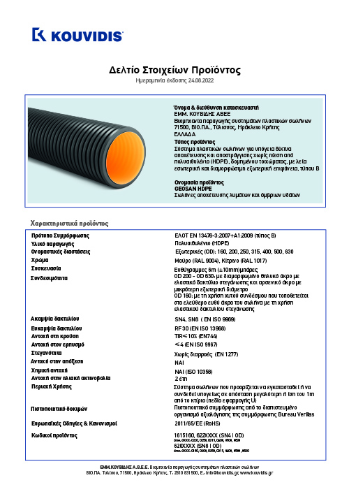 Os tubos de parede dupla estruturada GEOSAN, ondulados no exterior e lisos no interior, foram desenvolvidos pela KOUVIDIS em 2012 e apresentados no mercado grego em 2013 como uma solução mais segura e económica do que os tubos de cimento e PVC. São produzidos de acordo com o método de coextrusão a partir de matérias-primas especialmente estabilizadas de polietileno de alta densidade (HDPE) e são classificados como SN4 e SN8, de acordo com a sua rigidez de anel. Estão em total conformidade com a rigorosa Norma Europeia EN 13476-3 para Sistemas de tubagens plásticas para drenagem subterrânea sem pressão e esgotos feitos de cloreto de polivinil não plastificado (PVC-U), polipropileno (PP) e polietileno (PE).