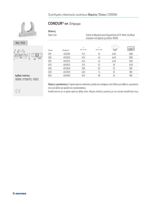 O grampo CONDUR foi projetado para montagem em tubos flexíveis e rígidos KOUVIDIS. Faz parte dos sistemas de tubos CONDUR – CONFLEX, MEDISOL – MEDIFLEX, SILCOR – SIFLEX, CONDUR HF – CONFLEX HF e MEDISOL HF – MEDIFLEX HF para gestão e proteção de cabos.